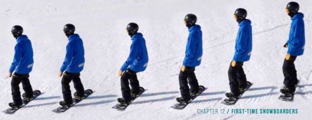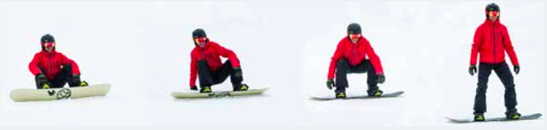 (2) 絕大多數的人,在熟練heel side滑行後,就能夠克服,一站起來板子就下滑的恐懼,之後就能順利自己起身。所以,一開始的時候,讓朋友幫忙,用腳擋住雪板,再用手輕輕輔助你起來,練習到落葉飄的階段,不論板子往哪邊滑動,都能有信心的控制好速度,做好一起身就立刻開始滑行的準備。(就像騎腳踏車一樣,當你把兩隻腳都放上踏板的時候,車子如果是靜止的,那很容易就跌倒了,所以,一上去就開始前進吧~)