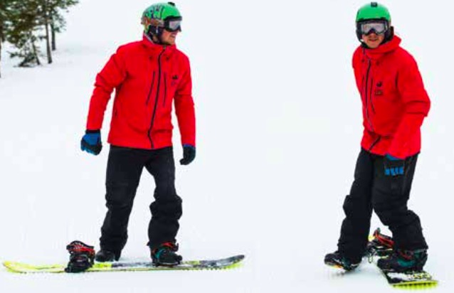 在落葉飄的階段,就開始讓視線,肩膀都對著板頭、板尾,往左邊移動看左邊,往右變看右邊。不需要看著山上也能減速,只要流暢地轉動雪板,將前進方向的板頭帶向上坡,就能減緩速度。